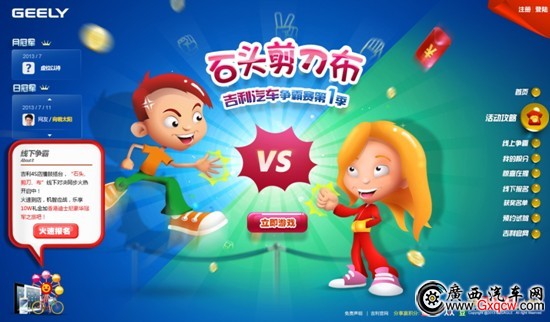 直接用新浪/騰訊微博、人人網(wǎng)、豆瓣網(wǎng)賬號登錄即可參加比賽;顒泳W(wǎng)址:http://promotion.geely.com/topic/ge/stjdb/