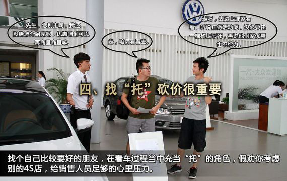 相信大家聽說過車托,是經(jīng)銷商在賣場找的一些善于忽悠的人來忽悠消費者購買。但是誰說只能有賣車的“托”,就不能有買車的“托”了。如果你身邊有個對車相對比較了解的“實力派”,能夠幫你“壓制”銷售,或是有個能在旁假裝“拉”你去考慮別的車或是別的店的“演技派”的時候,銷售為了留住客戶亮出底牌的幾率就要大多了。