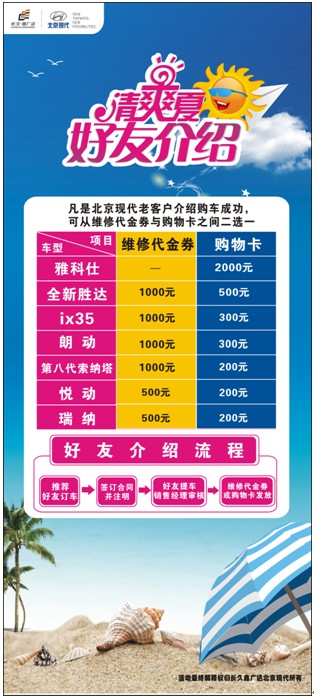 鑫廣達北京現(xiàn)代4S店 “好友介紹月”活動也在持續(xù)進行中!活動期間,推薦親朋好友成功購買北京現(xiàn)代車型即可獲贈購物卡,最高2000元!網(wǎng)上預約訂車,還能尊享500元購車禮金!詳細情況可咨詢我們的服務熱線:0771-3218115、3218116。