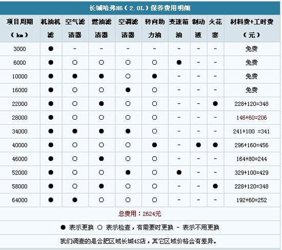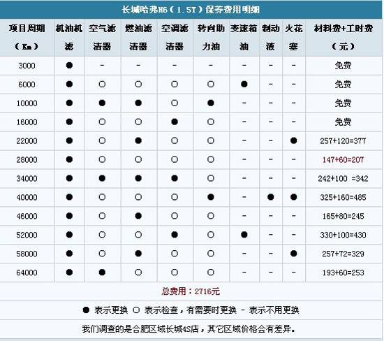 以60公里算來計(jì)算,長城哈弗H6 1.5T車型保養(yǎng)總的所需費(fèi)用為2716元,而2.0L車型所需費(fèi)用為2624元,兩者只差了92元。另外相比CR-V/途觀等合資車型五、六千的保養(yǎng)費(fèi)用來說,長城哈弗H6的保養(yǎng)算是比較實(shí)惠的。