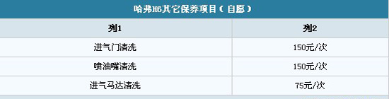 除了正常保養(yǎng)外,長城在規(guī)定里程內(nèi)根據(jù)用戶的需要還提供其他的保養(yǎng)項(xiàng)目,比如說進(jìn)氣門清洗、噴油嘴清洗以及進(jìn)氣馬達(dá)的清洗等,售價(jià)分別為150元、150元和75元。