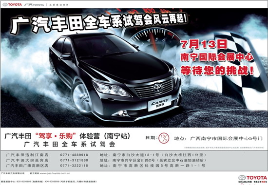 廣汽豐田“駕享·樂(lè)購(gòu)”全車系試駕會(huì)將于7月13日在南寧國(guó)際會(huì)展中心5號(hào)門舉行,屆時(shí),多家主流汽車媒體與眾多新凱美瑞、漢蘭達(dá)、逸致和雅力士的意向客戶都親身參與,零距離感受廣汽豐田全車系產(chǎn)品的優(yōu)越操控性能和卓絕科技品質(zhì),深度領(lǐng)略廣汽豐田全車系產(chǎn)品所帶來(lái)的巔峰科技魅力。