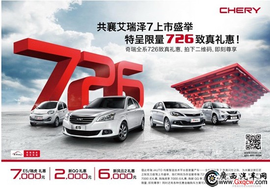尊享奇瑞7•26致真禮惠:購(gòu)E5、瑞虎優(yōu)惠7000元、購(gòu)新QQ優(yōu)惠2000元、購(gòu)新風(fēng)云2優(yōu)惠6000元!