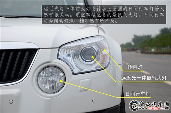 與進氣格柵搭配的燈組是前臉最生動的地方,遠近光燈一體前大燈設(shè)計加上圓圓的日間行車燈給人感覺很靈動。頂配車型配備的是氙氣大燈,日間行車燈并非時下流行的LED燈組,而是鹵素燈泡,檔次感有所不及。