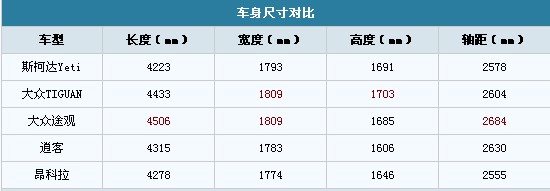 雖然同樣出自大眾的PQ35平臺,但是車身尺寸要比Tiguan小一號,當然相比國產(chǎn)途觀也要小不少,整體尺寸和昂科拉相近。不過有消息稱國產(chǎn)后會采用途觀一樣一樣的加長策略,這對消費者來說無疑是一個好消息。