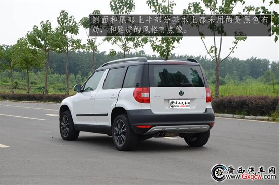 從側(cè)面很明顯地可以看出斯柯達Yeti方方正正的"盒子"造型,這種造型和秀爾有些相似,富有個性,同時黑色包圍增添了不少越野氣息。除了B柱以外A柱、C柱和D柱都采用的是隱藏式設(shè)計,突出了其與眾不同的個性。