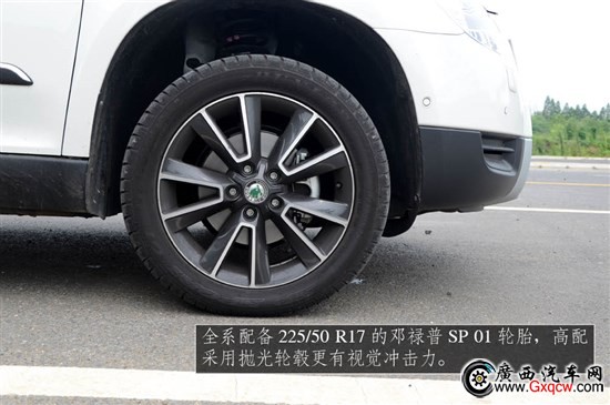 全系配備225/50 R17的鄧祿普SP sport01輪胎,不過輪轂樣式不同,高配采用拋光輪轂更有視覺沖擊力。備胎為非全尺寸設(shè)計。