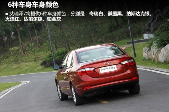 艾瑞澤7將提供白色、銀色、紅色、灰色、棕色以及黑色6種車身顏色,最低配車型配備195/65 R15的輪胎,其余車型均配備205/55 R16的輪胎。