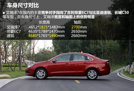車身尺寸很有優(yōu)勢:艾瑞澤7車身尺寸較大,長寬高為4652/1825/1483mm,軸距為2700mm,與比亞迪速銳和長城C50等主要競爭對手相比,在車身寬度和軸距上有較大的優(yōu)勢。得益于較長的軸距,艾瑞澤7在后排空間上有不錯的表現(xiàn)。