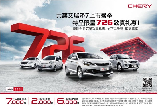 為共襄實力座駕上市盛舉,感恩回饋新老客戶,奇瑞汽車特別呈獻奇瑞7•26致真禮惠活動。此次禮惠活動將持續(xù)超過一個月,涵蓋瑞虎、新QQ、新風云2、E5等多款經(jīng)典車型。