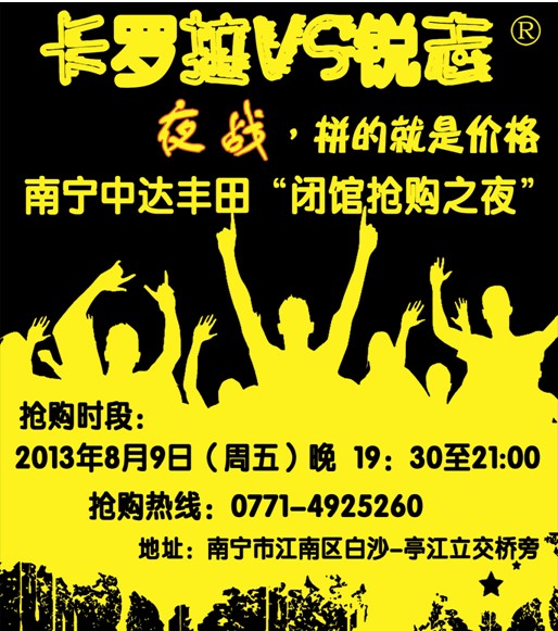 8月9日(周五)晚19:30——21:00,南寧中達豐田閉館銷售之夜將現(xiàn)場揭秘一汽豐田各款超高性價比家轎的特別優(yōu)惠政策。