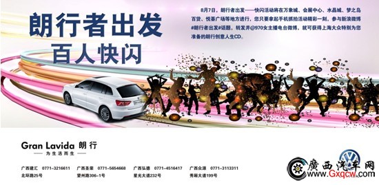 快閃是都市時(shí)尚文化中的一種,是現(xiàn)代人在忙碌之余和世界開的一個(gè)善意的玩笑,上海大眾攜手970女主播電臺(tái)在8月7號(hào)開展時(shí)尚快閃巡游的活動(dòng)。手機(jī)抓拍活動(dòng)現(xiàn)場照片,參與微博#朗行者出發(fā)#話題,轉(zhuǎn)發(fā)并@上海大眾廣西建匯4S店 @970女主播電臺(tái) 微博及@3位以上好友 就能獲得上海大眾朗行創(chuàng)意人生CD。