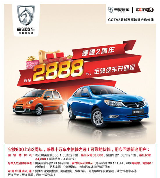 寶駿630超低特惠5.88萬(wàn)元起。國(guó)際品質(zhì)微轎樂(lè)馳低至3.48萬(wàn)元起,更有首付2888元寶駿汽車輕松貸回家,0利息,0擔(dān)保,讓您0負(fù)擔(dān)。更多活動(dòng)詳詢:0771-3869898,3930292