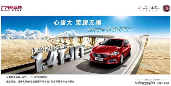 廣汽菲亞特南寧金壯源4S旗艦店8月10號(hào)廣汽菲亞特汽車專場(chǎng)試駕會(huì)激情啟動(dòng),讓您更直觀感受廣汽菲亞特汽車的熱情,意大利人對(duì)品質(zhì),激情,動(dòng)力的完美永不止步地追求,菲亞特團(tuán)隊(duì)的激情和造車工藝的精致,操控性和舒適性所打造出的完美效果相信在您試過菲亞特汽車令您稱贊不絕,8月10號(hào)讓您親身體驗(yàn)這一切,無論您買不買車,到店均可試駕,報(bào)名并參加試駕即有禮相送,廣汽菲亞特金壯源4S店誠意邀請(qǐng),敬請(qǐng)光臨。