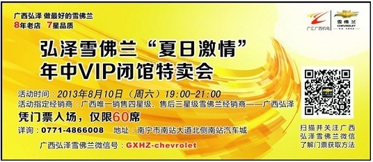 8月10日(周六)晚19時,弘澤雪佛蘭將為你舉辦“愛她,就送她科魯茲”VIP閉館特賣會。本次活動僅限招待弘澤雪佛蘭的VIP客戶和預約貴賓,全部來賓均須憑門票入場,約滿即止。屆時全系車型將以同城最低價特賣,此外還有額外返利4%、二手車原價回購置換、延長保修、優(yōu)先提車等更多實惠。此外,活動當晚還有燒烤、冰飲、冷餐免費提供,預約到店的女嘉賓還有科魯茲限量DIY車模相贈。還在猶豫什么?即刻預約,我要與你共度這個浪漫的七夕。預約熱線0771-4866008。