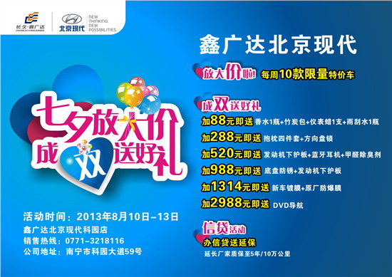 七夕親密約“惠”,鑫廣達(dá)北京現(xiàn)代汽車成雙也浪漫!2013年8月10日-8月13日,鑫廣達(dá)北京現(xiàn)代科園店迎七夕,放大“價(jià)”,成“雙”送好禮!活動(dòng)期間熱門車型惠享七夕價(jià):瑞納七夕特別版最低至66900元!經(jīng)典SUV途勝七夕特別版最低至125800元……,每周推出10款限量特價(jià)車型,訂完即止,趕緊搶購吧!