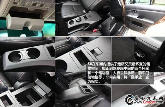 另外,在車(chē)內(nèi)儲(chǔ)物空間設(shè)計(jì)方面,S6也帶來(lái)了較大的驚喜,如方向盤(pán)的左下方的小型儲(chǔ)物格、正副駕駛座中間的兩個(gè)杯座和一個(gè)儲(chǔ)物格、大容量扶手箱、前車(chē)門(mén)儲(chǔ)物格等,非常實(shí)用,將“隨手放”變?yōu)楝F(xiàn)實(shí)。