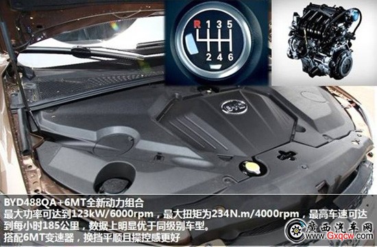 S6 2.4L手動(dòng)尊貴型搭載的是BYD488QA+6MT全新動(dòng)力組合。發(fā)動(dòng)機(jī)動(dòng)力非常充沛,即使在長(zhǎng)長(zhǎng)的緩坡上行駛依然可以感覺(jué)到持續(xù)不斷的強(qiáng)勁動(dòng)力輸出,最大功率可達(dá)到123kW/6000rpm,最大扭矩為234N.m/4000rpm,最高車(chē)速可達(dá)到每小時(shí)185公里,數(shù)據(jù)上要明顯優(yōu)于同級(jí)別車(chē)型。且搭配6MT變速器,不僅增加了換擋的平順性,提高了車(chē)輛的操控感,做到了較低油耗和充沛動(dòng)力輸出的平衡。