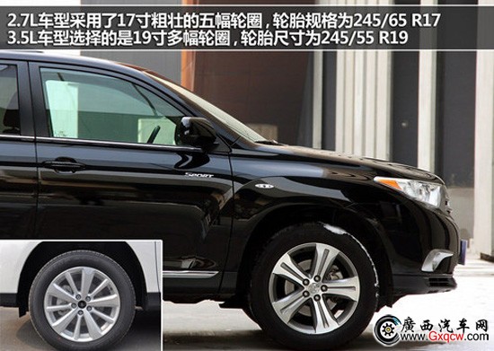 漢蘭達的車身尺寸較為高大,這也是吸引消費者的一個因素之一,輪胎尺寸上,2.7L車型采用了17寸粗壯的五幅輪圈,輪胎規(guī)格為245/65 R17。3.5L車型選擇的是19寸多幅輪圈,輪胎尺寸為245/55 R19,兩款輪胎尺寸都比較令人滿意。