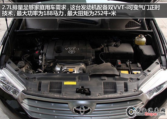 如果您對漢蘭達的四驅(qū)系統(tǒng)有過分追求的話,那么2.7L排量足夠家庭用車需求,這臺發(fā)動機配備雙VVT-i可變氣門正時技術(shù),最大功率為188馬力,最大扭矩為252牛•米。傳動系統(tǒng)上,使用的是一臺6速手自一體變速箱。