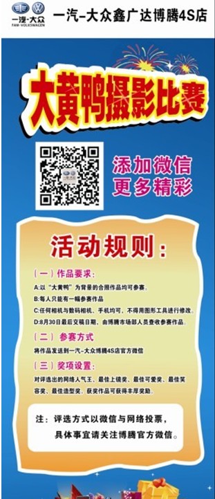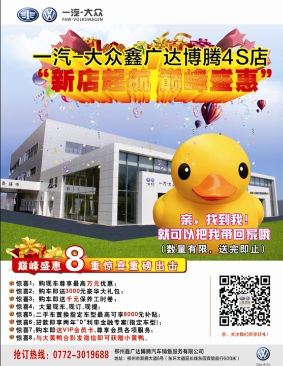 8月16日至18日,在展廳也可享受車展優(yōu)惠,車展現(xiàn)場找到大黃鴨就可以找到我們,找到我們就有大黃鴨送哦(數(shù)量有限,送完即止)。