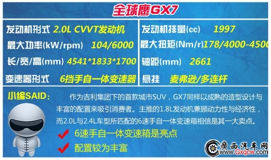 推薦車型:吉利全球鷹GX7(2.0L自動)