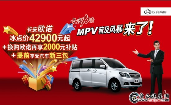 長安力量• MPV普及風(fēng)暴來了!長安歐諾1.3全系直降5000元,冰點價42900元起!歐諾全系提前享受新三包!換購再享2000元優(yōu)惠!心動價,新享受!詳情咨詢南百汽車:0771-3815442