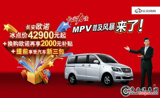 為消費(fèi)者提供最優(yōu)質(zhì)的產(chǎn)品、創(chuàng)造最有價(jià)值的誠(chéng)信服務(wù)是長(zhǎng)安汽車(chē)一直履行的原則。8月20日至12月31日,長(zhǎng)安力量 • MPV普及風(fēng)暴來(lái)了!微客價(jià)買(mǎi)MPV,前往長(zhǎng)安汽車(chē)4S店訂購(gòu)長(zhǎng)安歐諾,不僅可以提前享受?chē)?guó)家新三包政策,更能以冰點(diǎn)價(jià)擁有歐諾1.3L全系車(chē)型,最低僅需42900元起!價(jià)廉服務(wù)優(yōu),絕對(duì)是購(gòu)買(mǎi)歐諾的最佳時(shí)機(jī)!