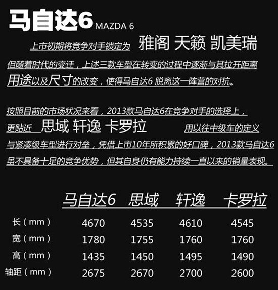 記得06年作者本人家中購入馬自達(dá)6的時(shí)候,當(dāng)時(shí)的競爭對手一直都鎖定在有“日系三劍客”之稱的雅閣、天籟、凱美瑞身上,就當(dāng)時(shí)的市場局面和發(fā)展速度來看,這樣的定位完全沒有問題,即便馬自達(dá)6在設(shè)計(jì)上運(yùn)動(dòng)化的元素更為突出,但至少在價(jià)格和級別上屬于直接競爭對手,當(dāng)時(shí)的汽車市場車型也沒有現(xiàn)在這樣紛亂復(fù)雜。經(jīng)過10年的轉(zhuǎn)變,當(dāng)年的三劍客也已分別經(jīng)歷了2-3次換代,尺寸和用途的轉(zhuǎn)變,使得馬自達(dá)6已經(jīng)不再有與其競爭的直接原因,而睿翼在定義上也完全與它們沒有交集。這樣的現(xiàn)象,也就迫使馬自達(dá)6不得不將競爭對手轉(zhuǎn)移到價(jià)格更為接近,且尺寸和用途也基本一致的緊湊級車身上,或許在面對競品兩個(gè)級別對手的戰(zhàn)役中,馬自達(dá)6都能占到不少便宜,B車A價(jià)便是它能夠?qū)崿F(xiàn)66萬輛銷量的法寶。