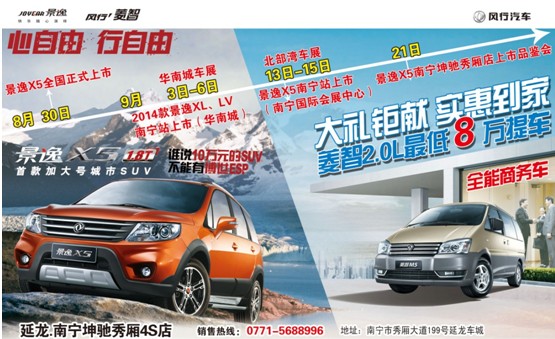 9月3日上午10:00南寧坤馳秀廂4S店將在在華南城東盟汽車展銷會(huì),舉行“經(jīng)典大兩廂 舒適新生活——2014款景逸煥新上市”活動(dòng),活動(dòng)誠邀媒體屆朋友和風(fēng)行新老客戶參加,現(xiàn)場(chǎng)除時(shí)尚熱辣的歌舞表演以及互動(dòng)活動(dòng),還將派發(fā)多重禮品,當(dāng)天訂購14款景逸將享多重驚喜優(yōu)惠,部分車型的優(yōu)惠高達(dá)萬元。同時(shí)性能超越同級(jí)的景逸X5也將驚艷亮相車展現(xiàn)場(chǎng)。