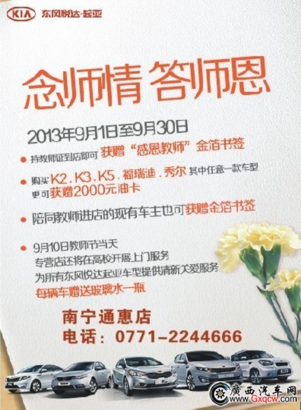 老師作為人類靈魂的工程師,他們用青春和汗水,播種未來(lái)希望。在金秋九月收獲季,讓我們一起感恩播種者。隨著教師節(jié)來(lái)臨,東風(fēng)悅達(dá)起亞將開(kāi)啟感恩回饋,對(duì)全國(guó)教育工作者致以崇高敬意。同時(shí),在即將到來(lái)的中秋和國(guó)慶,東風(fēng)悅達(dá)起亞也將為消費(fèi)者呈上節(jié)日好禮。