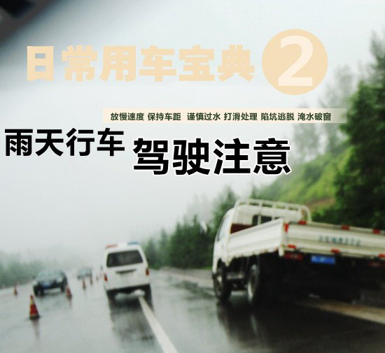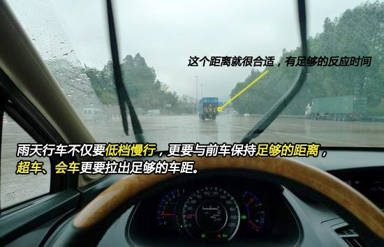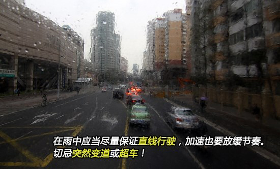 雨天行車不僅要低檔慢行,更要與前車保持足夠的距離,超車、會(huì)車時(shí),也要與其他車輛和道路邊緣保持足夠的安全距離。如果需要停車,盡量提前100米左右減速、緩踩剎車,避免輪胎打滑,也使后面來車有足夠的準(zhǔn)備時(shí)間。在雨中更不要離大貨車太近,大車濺起的水花會(huì)讓小車司機(jī)在幾秒鐘內(nèi)看不清車外的情況,這樣就很容易發(fā)生意外。