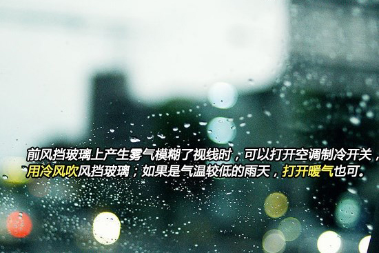 雨中開車,視線不清是最大隱患,除了正確使用燈光,保證視野清楚也是非常重要的。最常見的麻煩就是前風(fēng)擋玻璃上產(chǎn)生霧氣模糊了視線,此時(shí)可以打開空調(diào)制冷開關(guān),用冷風(fēng)吹風(fēng)擋玻璃;如果是后風(fēng)擋玻璃出現(xiàn)霧氣,則需要打開后風(fēng)擋玻璃加熱以消除霧氣。如果是氣溫較低的雨天,打開暖氣模式也是個(gè)不錯(cuò)的辦法。熱風(fēng)會(huì)將車廂內(nèi)的水分烘干,玻璃就會(huì)變得透亮,而且不會(huì)再次起霧。不過這個(gè)方法見效稍慢。