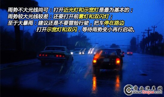 雨天光線差,車燈自然是必須要開啟的,因?yàn)闊艄獠粌H是為了讓自己看清路況,更是為了提高車輛的辨識(shí)度,讓周圍的車輛可以看到自己,避免意外。不過各車燈也要根據(jù)實(shí)際情況正確開啟:雨勢(shì)不大光線尚可時(shí),打開近光燈和示寬燈是最為基本的;雨勢(shì)較大光線較差時(shí),還要打開前霧燈和雙閃燈;至于大暴雨,建議還是不要冒險(xiǎn)行駛,把車停在路邊打開示寬燈和雙閃,等待雨勢(shì)變小再行啟動(dòng)。