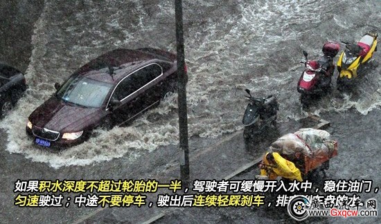 首先,我們需要注意水深,如果水深超過排氣管,這很容易使車輛熄火,還是不要輕易嘗試。如果積水深度不超過輪胎的一半,駕駛者可小心涉水,但一定要慢,猛然沖進(jìn)水里的話很容易讓雨水進(jìn)入發(fā)動(dòng)機(jī)進(jìn)氣系統(tǒng),造成熄火。正確的方法是降低檔位和速度,平穩(wěn)地駛?cè)胨,穩(wěn)住油門,勻速前進(jìn),并且不要在水中停車。經(jīng)過積水后,連續(xù)輕踩剎車以便將剎車盤內(nèi)的水分排空。