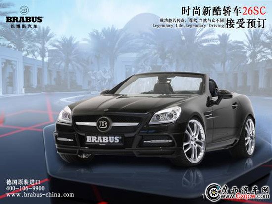 26SC——該車基于全新的SLK改裝升級而成。 巴博斯26SC車身長寬高分別為4139mm /1817mm /1303 mm,改裝了前防撞杠帶前擾流唇附加組件、側(cè)裙以及后擾流定風(fēng)翼等等。另外,在車輪方面則采用了配備高性能跑車車胎的19英寸Monoblock S 輕質(zhì)合金輪轂。僅需6.3秒即可從靜止?fàn)顟B(tài)加速到100公里/小時(62英里/小時),最高時速達(dá)250公里。