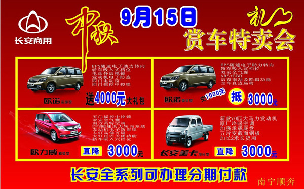 (廣西汽車網(wǎng) 訊)近日,編輯從長安汽車南寧順奔4S店了解到,農(nóng)歷八月十五是一年好時(shí)節(jié)——中秋節(jié),我國的傳統(tǒng)節(jié)日之一。為感謝廣大到店賞車客戶對(duì)長安商用的支持,南寧順奔公司于2013年9月15日中秋節(jié)前夕,舉辦一場中秋賞車特賣會(huì)活動(dòng)。活動(dòng)期間長安汽車全系列車型特價(jià)銷售,現(xiàn)場訂車即可參加幸運(yùn)轉(zhuǎn)盤,精彩大禮等你拿;顒(dòng)僅此一天,千萬不要錯(cuò)過!