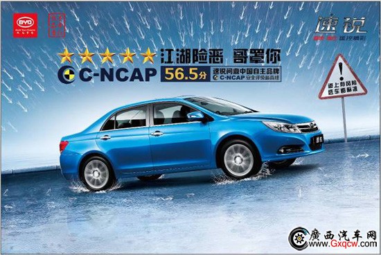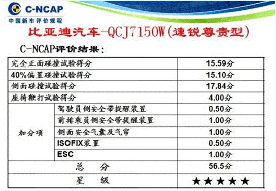 2013年9月7日,中國(guó)汽車技術(shù)研究中心公布了2013年度第三批C-NCAP評(píng)價(jià)結(jié)果,比亞迪速銳以56.5的高分榮獲五星安全評(píng)價(jià),并一舉刷新自主品牌56.3的最高記錄,榮膺最安全自主轎車,超越了同批次碰撞的福特翼虎、大眾新桑塔納等眾多合資車型。