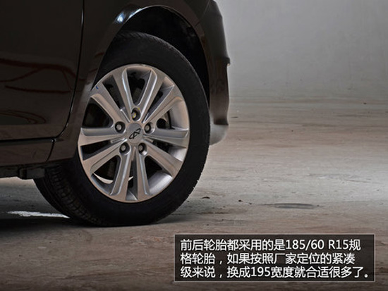 E3明顯是為了搶占合資小型車市場的份額,5.29-6.79萬的售價也不難看出,雪佛蘭賽歐才是它的對手。前后輪胎都采用的是185/60 R15規(guī)格輪胎,如果按照廠家定位的緊湊級來說,換成195寬度就合適很多了。好在厚道的奇瑞給E3配備了全尺寸備胎,規(guī)格還是185/60 R15的佳通的Comfort 228輪胎。