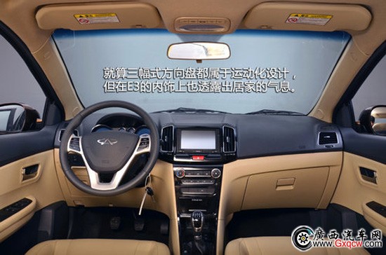 就算三幅式方向盤都屬于運動化設計,但在E3的內(nèi)飾上也透露出居家的氣息。對于5萬元起步的車來說,采用塑料材質(zhì)中控臺也在情理之中,不過E3的做工真的是表現(xiàn)了奇瑞的進步之處,接縫處理勻稱恰當。圓潤的方向盤雖然是三幅式設計,但毅然給人居家氣息,并且提供了多功能按鍵。