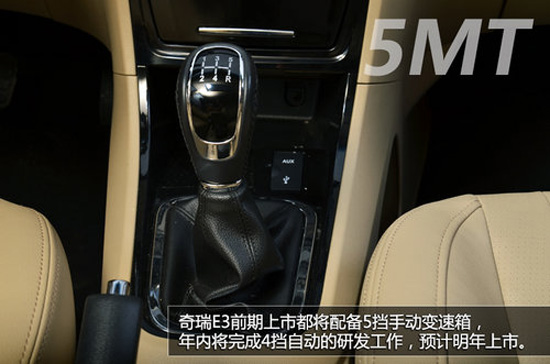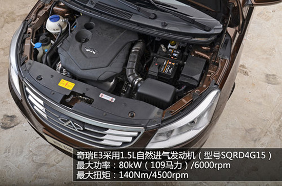 奇瑞E3采用1.5L自然進氣發(fā)動機(型號SQRD4G15),最大功率:80kW(109匹馬力)/6000rpm,最大扭矩:140Nm/4500rpm。這款發(fā)動機與奇瑞E5搭載的發(fā)動機只是稍作調(diào)整,動力參數(shù)基本相同。奇瑞E3前期上市都將配備5擋手動變速箱,年內(nèi)將完成4擋自動的研發(fā)工作,預計明年上市。