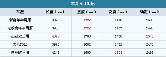 由于前臉的改變,新款嘉年華車身尺寸也有細微變化,它的長寬高分別為3970*1722*1470(mm),長、高分別比老款增加了20mm和3mm,軸距增加了5mm。不過這樣的車身尺寸在同級別中依舊不占優(yōu)勢,比K2兩廂和愛唯歐兩廂版都要小一些。