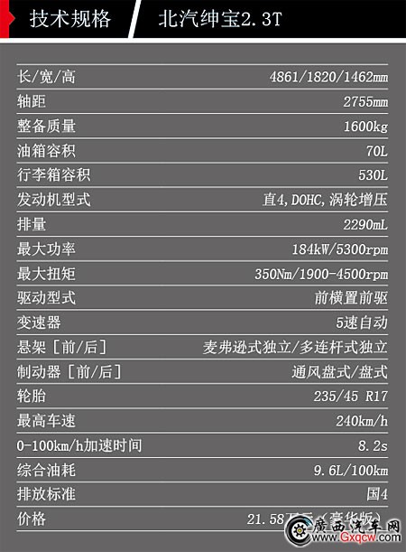 總體而言,紳寶2.3T很好地吸收了第一代薩博9-5的技術(shù),北京汽車也打造出了自己想象中的中型轎車。但是就品相而言,不論是設(shè)計還是用料都有很大的提升空間。站在安全角度來評價這臺自主車,它也有讓對手值得學(xué)習(xí)的地方。由于使用了高端的輪胎,100km/h-0的制動測試只用了39.40m,這個成績還不錯。行駛中的NVH也控制得很好,60km/h和90km/h兩個速度區(qū)間的噪音為59.8和63.6dB。對于不想花太多錢又想買一臺大車的人來說,紳寶無疑是個不錯的選擇,全系都配渦輪增壓發(fā)動機,而這臺旗艦版的2.3T車型更是大力推銷自己的動力性能。如果好奇,你完全可以找家4S店去試試。
