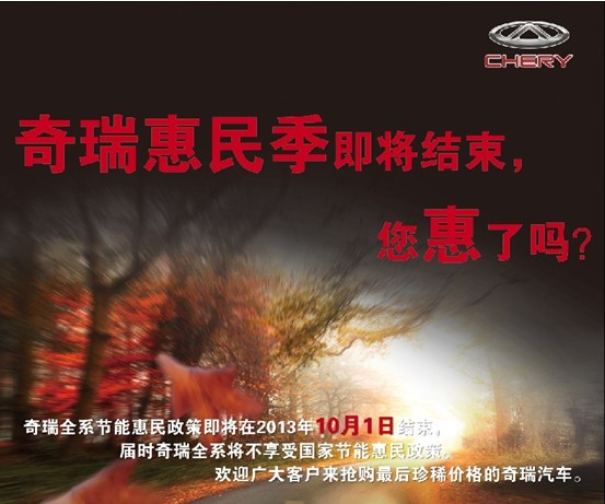 據悉現(xiàn)行的節(jié)能汽車補貼政策到9月30日即將結束,這意味著客戶在10月1日以后購1.6L一下排量的車型,將會多支付3000元現(xiàn)金。為了回饋廣大新老客戶,廣西鑫廣達奇瑞旗艦店攜旗下8店感恩回饋,9月28日惠民政策最后的瘋狂——總經理底價簽售會!9月28日活動當天奇瑞全系車型價格將大幅度優(yōu)惠!優(yōu)惠力度空前!更有總經理現(xiàn)場簽售!