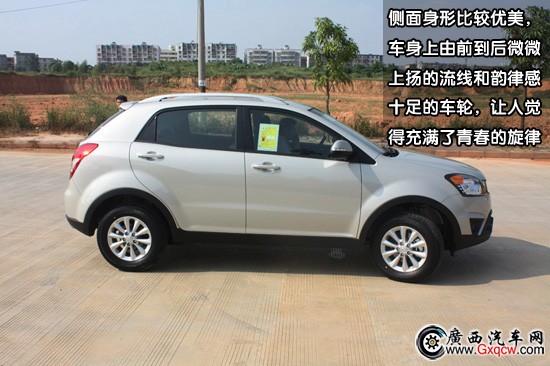從車(chē)子的側(cè)面來(lái)看,可以發(fā)現(xiàn),車(chē)子整體的身形還是比較優(yōu)美的,車(chē)身上由前到后微微上揚(yáng)的流線和韻律感十足的車(chē)輪,讓人覺(jué)得充滿了青春的旋律。雖然車(chē)的個(gè)頭不是很高,但是足以展現(xiàn)緊湊型SUV的運(yùn)動(dòng)潛質(zhì)。雙龍柯蘭多軸距為:2650mm,作為一款緊湊型SUV,這個(gè)長(zhǎng)度還是有一定的可比性的,比新勝達(dá)稍短,比指南者稍長(zhǎng)。