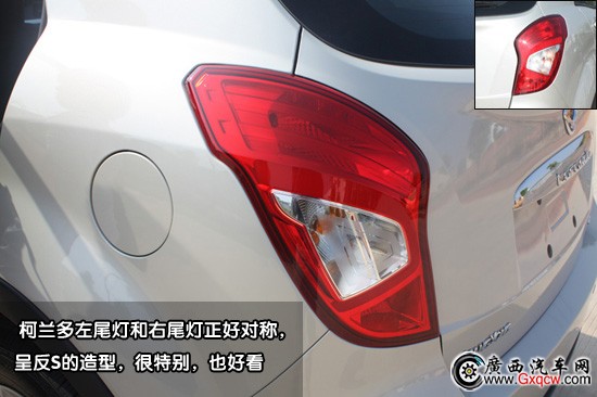 柯蘭多尾燈的位置并不是很高,也不算很大,但是也已經(jīng)足夠了。右尾燈類似于S的造型,左尾燈和右尾燈正好對(duì)稱,呈反S的造型。