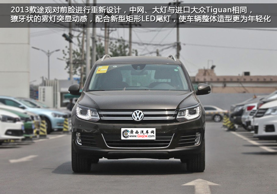 2013款的途觀在外觀上變化不大,但是通過對細節(jié)的改動來提升動感,前臉的上半部分與2013款進口大眾Tiguan相同,下格柵面積更大并增加了鍍鉻飾條,大燈以及霧燈樣式經(jīng)過重新設計。新造型的矩形尾燈加入了LED技術(shù),符合時下流行設計。