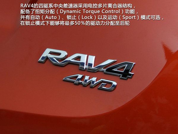 RAV4的四驅(qū)系中央差速器采用電控多片離合器結(jié)構(gòu),普通情況下動力完全分配在前輪,當(dāng)車輛在感受到駕駛?cè)宿D(zhuǎn)動方向盤之時,便會自動將部分的動力傳遞至后輪。在SPORT模式下,電子系統(tǒng)偵測轉(zhuǎn)向角度以及車輛的偏航率,此時動態(tài)扭力控制(DTC 4WD)系統(tǒng)會讓后輪至少預(yù)先獲得10%以上的動力,通過控制扭矩分配提高車輛的操控性。駕駛者能在38km/h的時速之下選擇鎖止模式,能夠?qū)⒆疃?0%的驅(qū)動力分配至后輪。