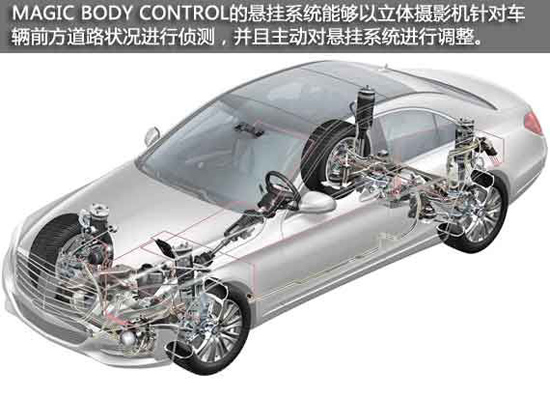 為了能夠進(jìn)一步的提高舒適性,奔馳為全新S級導(dǎo)入了稱為MAGIC BODY CONTROL的懸掛系統(tǒng),這個宣稱全球第一款量產(chǎn)版〝長眼睛〞的懸掛系統(tǒng),能夠透過ROAD SURFACE SCAN系統(tǒng),以立體攝影機(jī)針對車輛前方道路狀況進(jìn)行偵測,并且針對懸吊系統(tǒng)主動進(jìn)行調(diào)整。