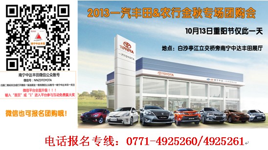 10月13日重陽節(jié),廣西唯一的一汽豐田全國(guó)十佳金牌店——南寧中達(dá)豐田牽手農(nóng)業(yè)銀行展開2013年度一汽豐田全系&農(nóng)行專場(chǎng)團(tuán)購會(huì)。